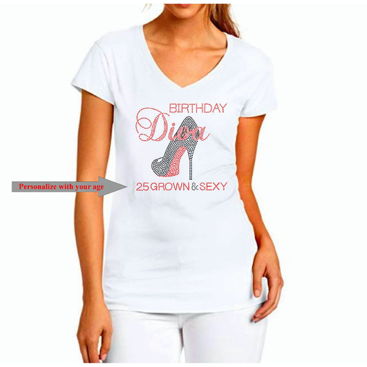 Grown and Sexy Birthday Diva Personalized Rhinestone Tee
