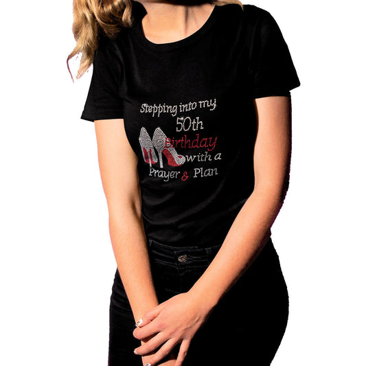 Stepping Into My Birthday With Prayer Plan Personalized Age Rhinestone Tee