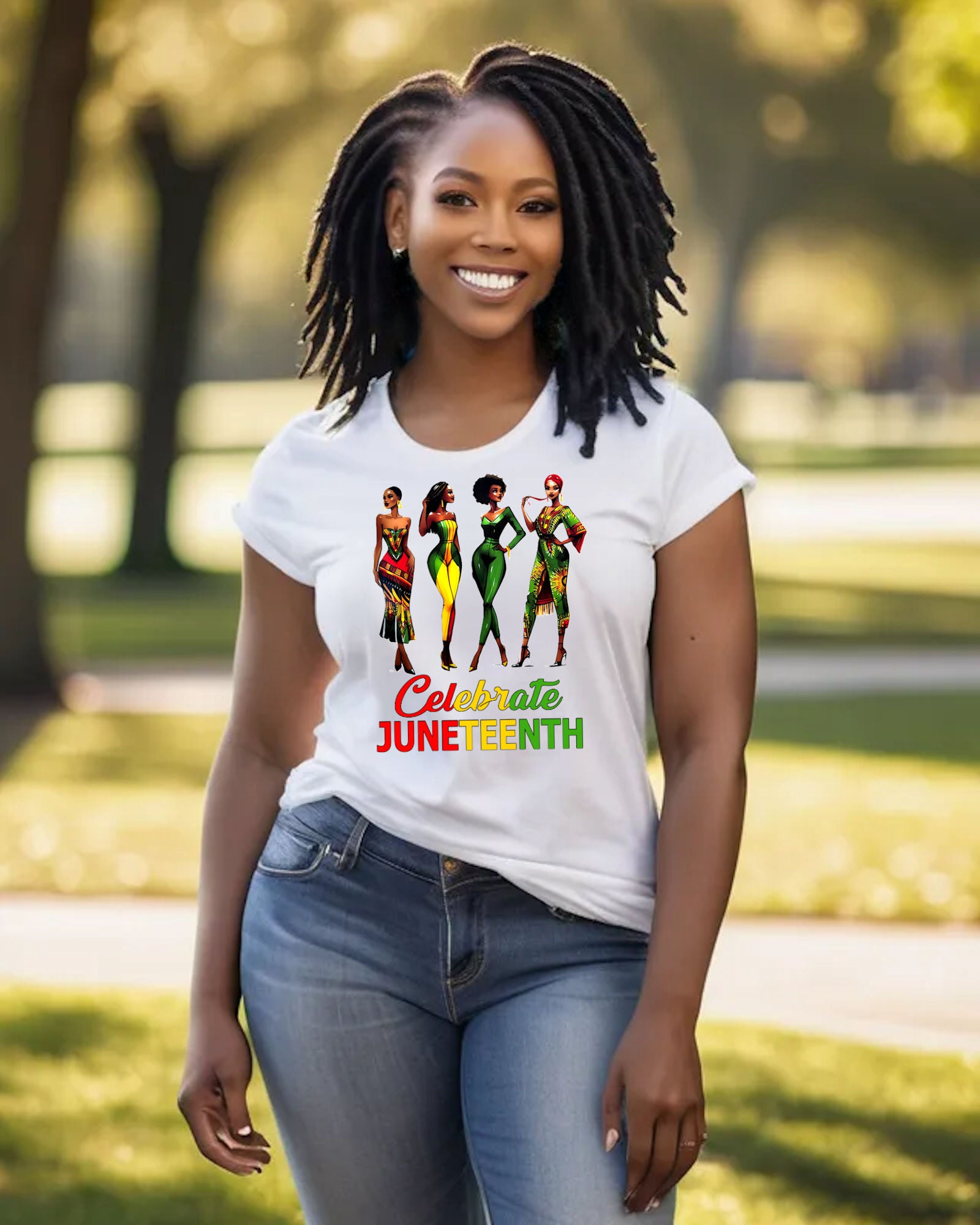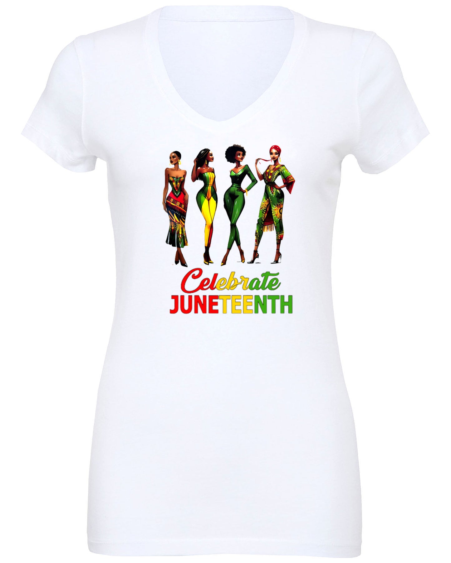 This striking design features 4 diverse divas joyfully honoring Juneteenth, adorned in stunning, vibrant attire. A fantastic way to commemorate this momentous day of liberation.