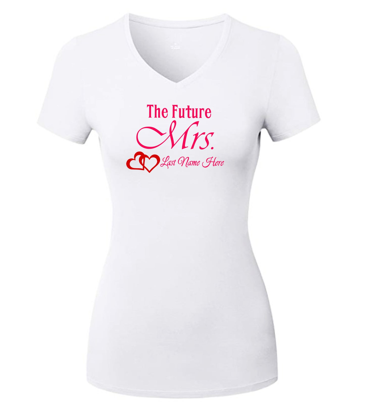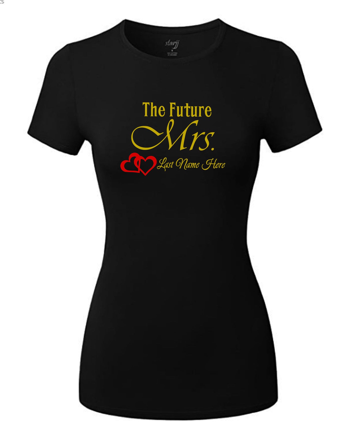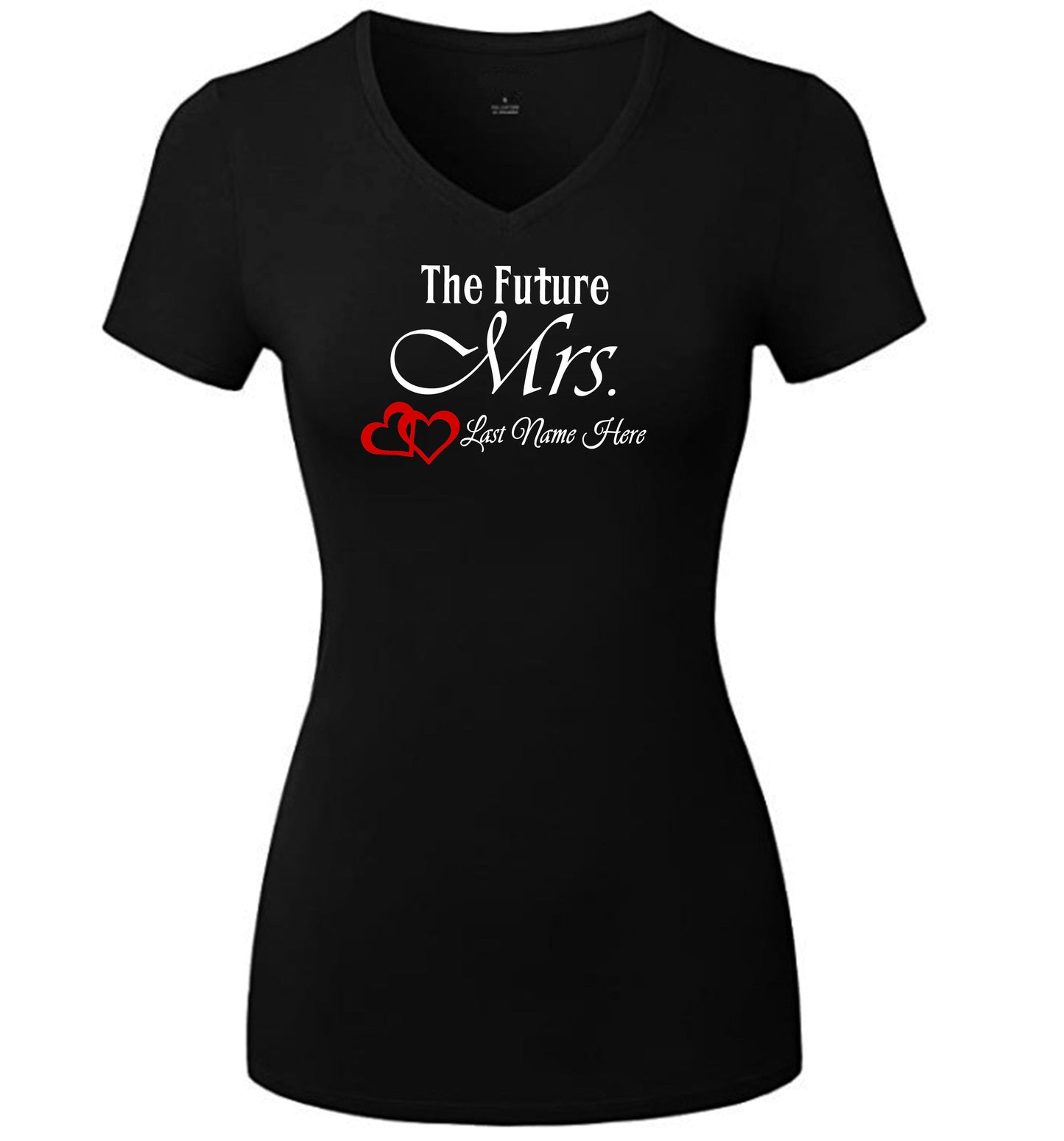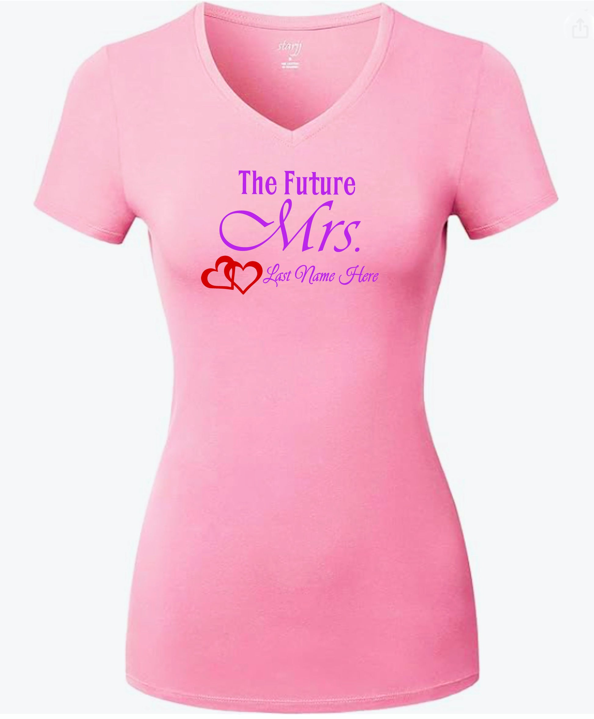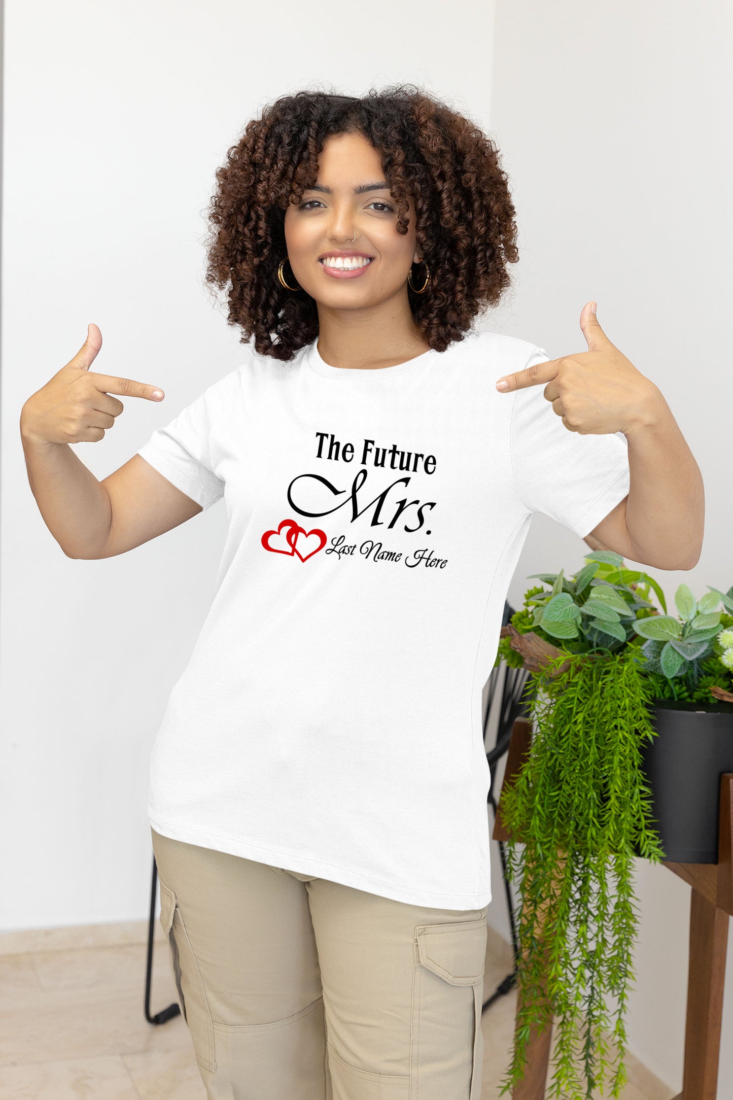 This personalized t-shirt is a must-have for any soon-to-be bride, perfect for wearing at a bridal shower, engagement party, or any special occasion. Its stylish design and comfortable fit make it the ideal way to proudly display the bride-to-be's future last name.
