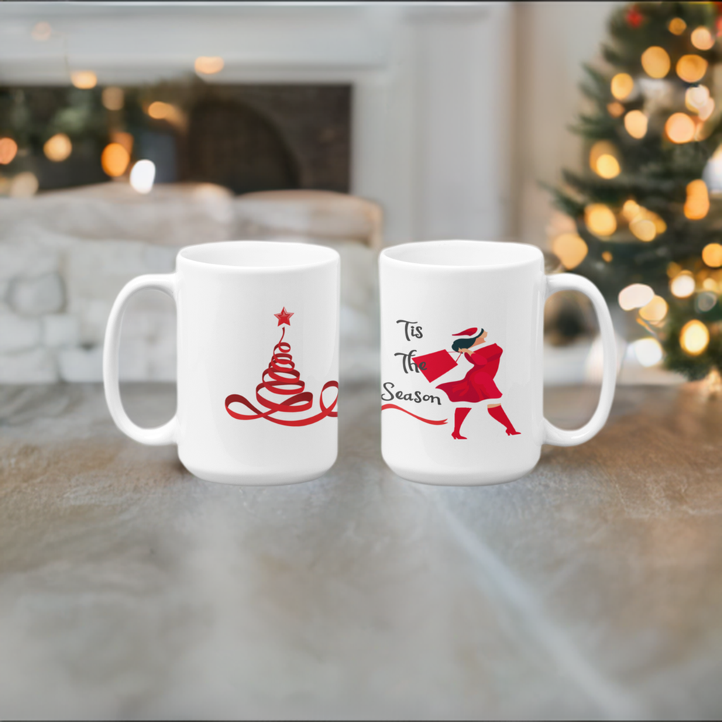Experience the joy of Christmas with this fun and festive Ceramic Mug! Exclusive designs feature a merry woman strolling off to shop, with a special Christmas tree fashioned from red ribbon. Celebrate the season with this cheerful mug!