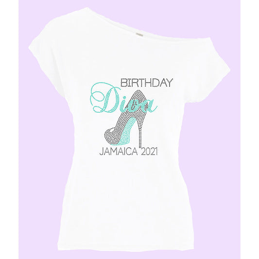 Birth Day Diva Rhinestone Off Shoulder T Shirt