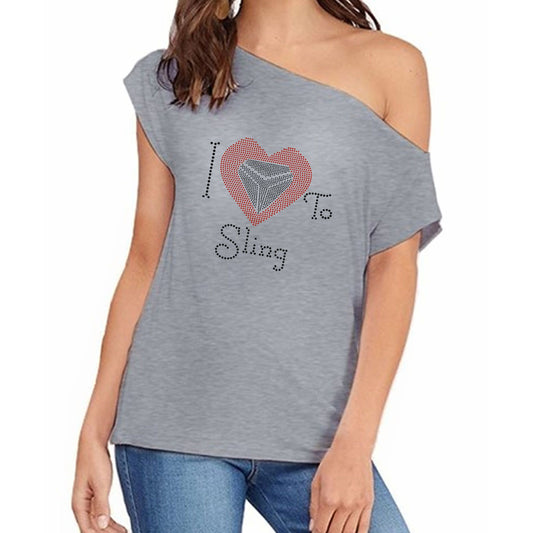 I Love To Sling Rhinestone Heart Off Shoulder Tee