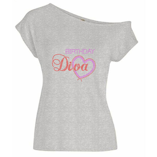 Birthday Diva With Heart Rhinestone Off Shoulder T-Shirt