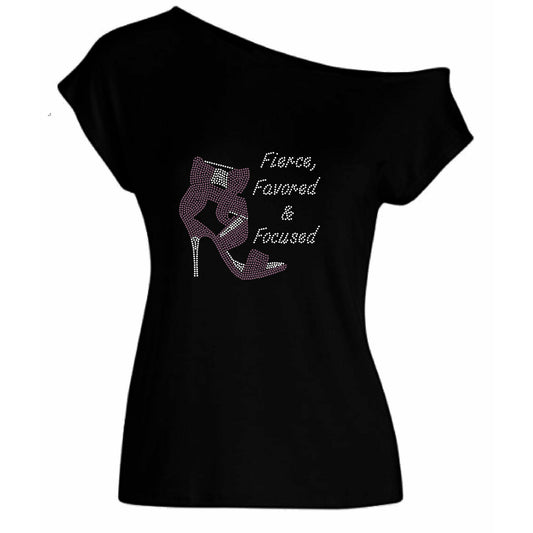 Fierce Favored & Focused Rhinestone Stiletto Off Shoulder Tee