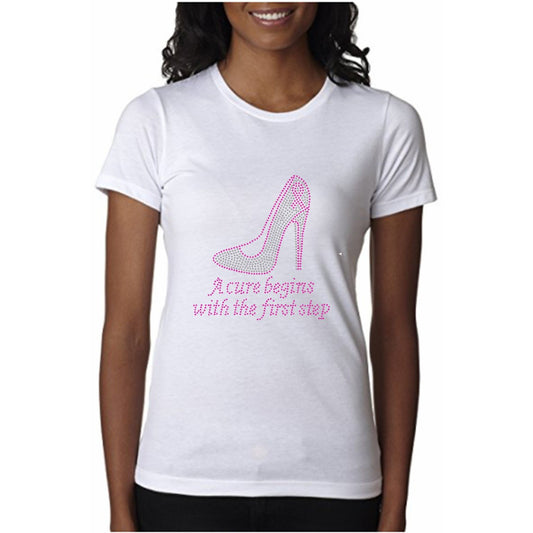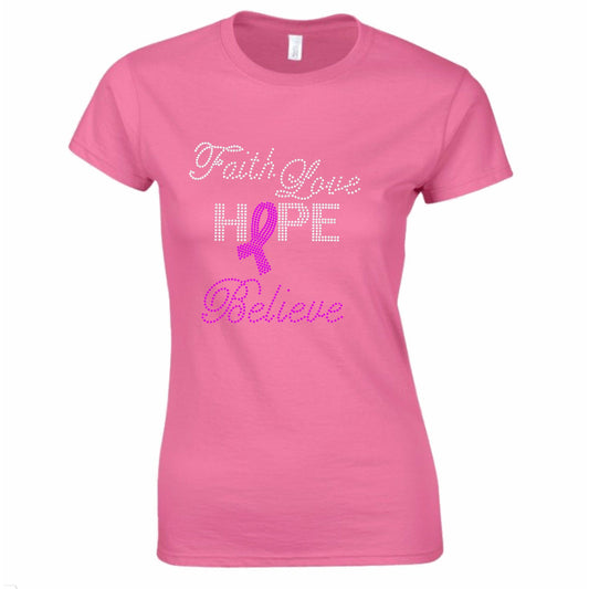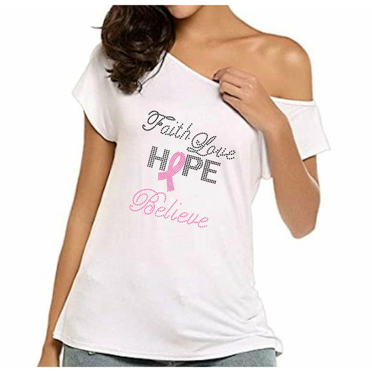 Faith Love Hope Breast Cancer Awareness Rhinestone Off The Shoulder Tee
