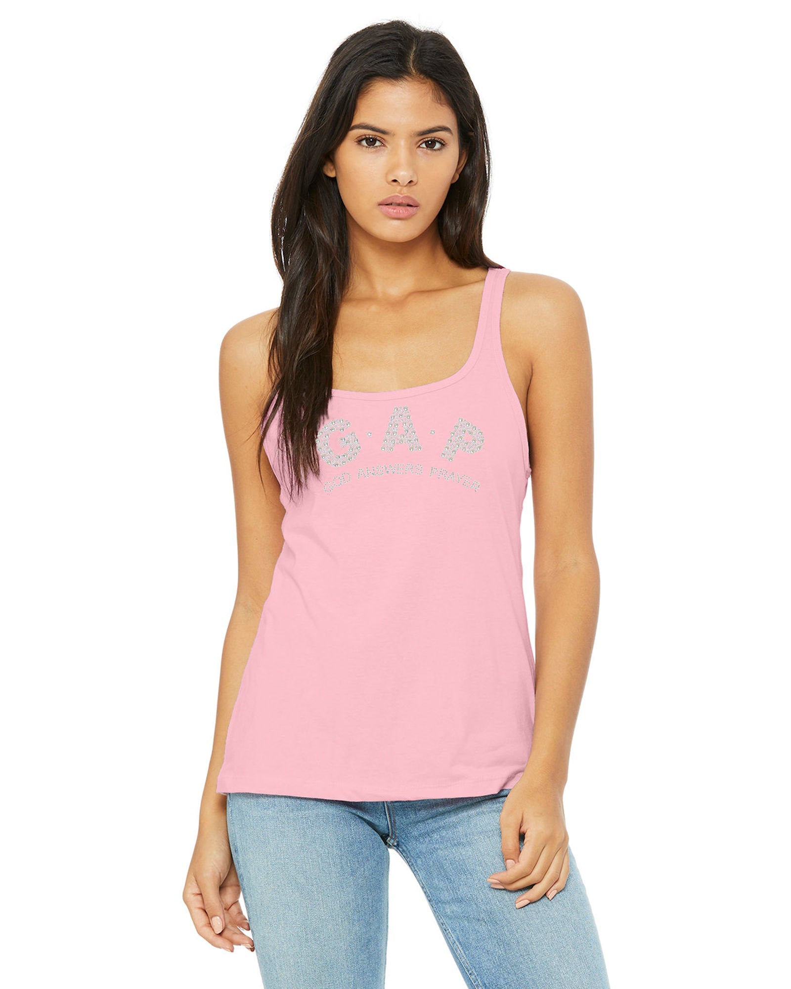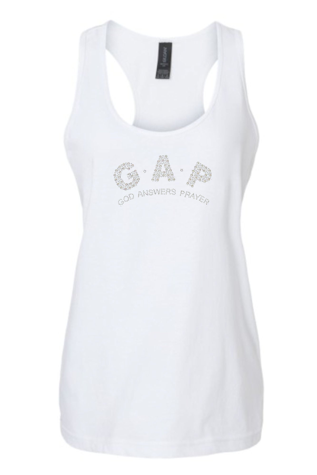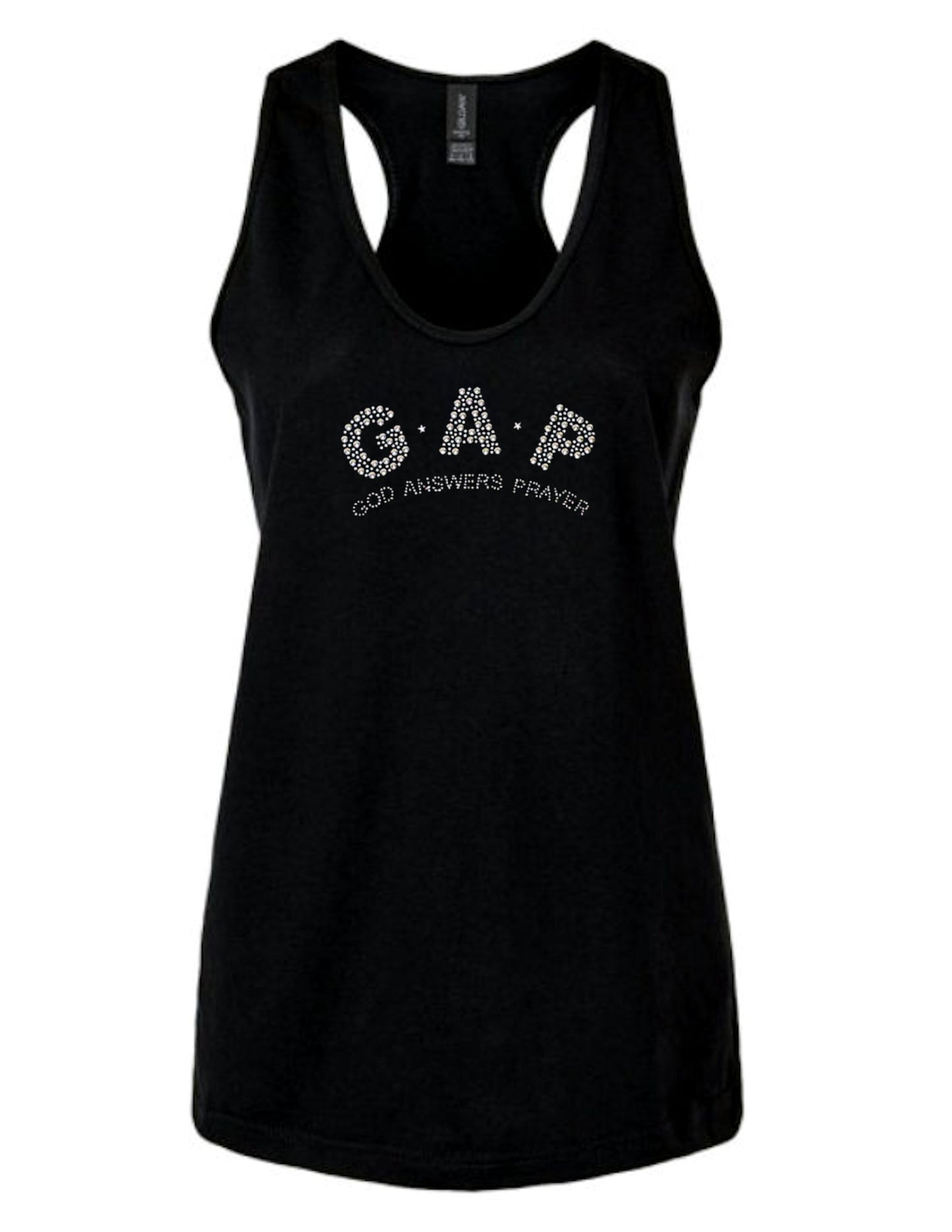 Beautiful and inspirational Rhinestone G.A.P God Answers Prayers spelled out in crystal rhinestones. A testament to faith in sparkling form, each rhinestone is delicately arranged for a striking look that will bring a touch of sophistication to any ensemble.